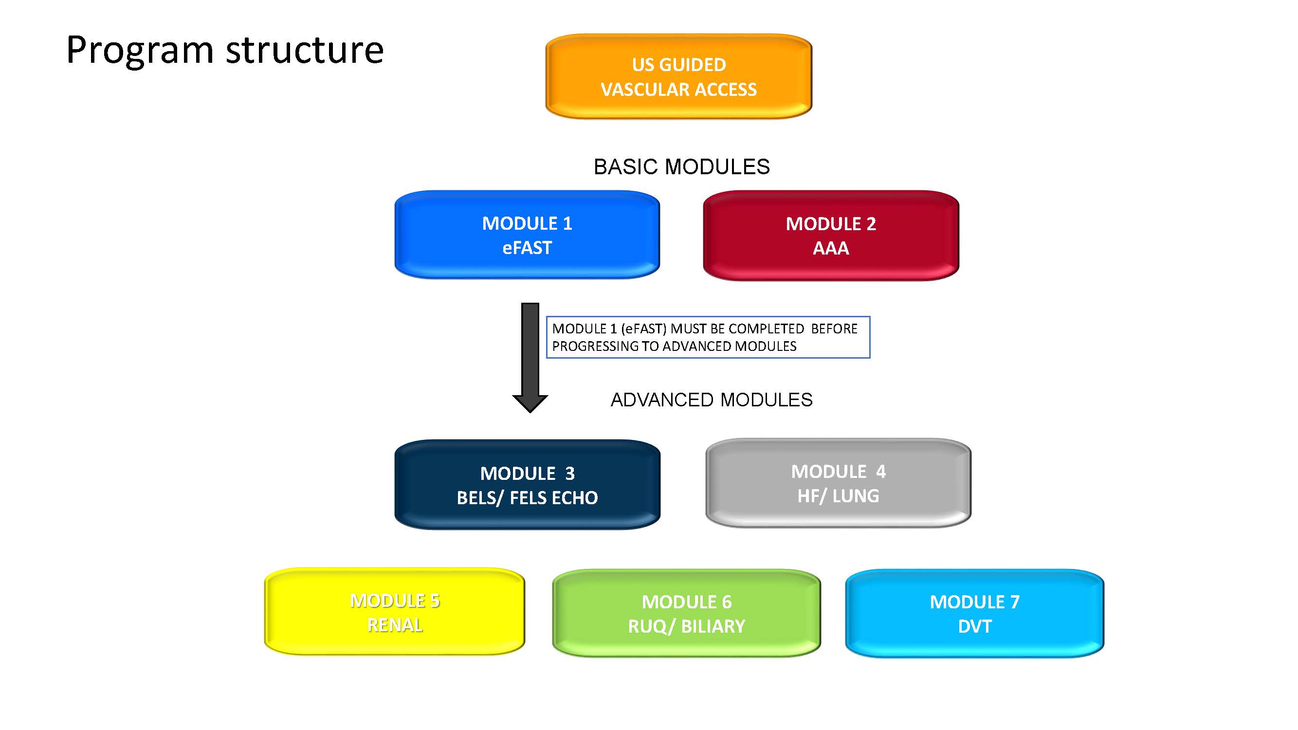 - ADVANCED courses require completion of eFAST module credentialing prior to commencing this training (see program structure diagram).